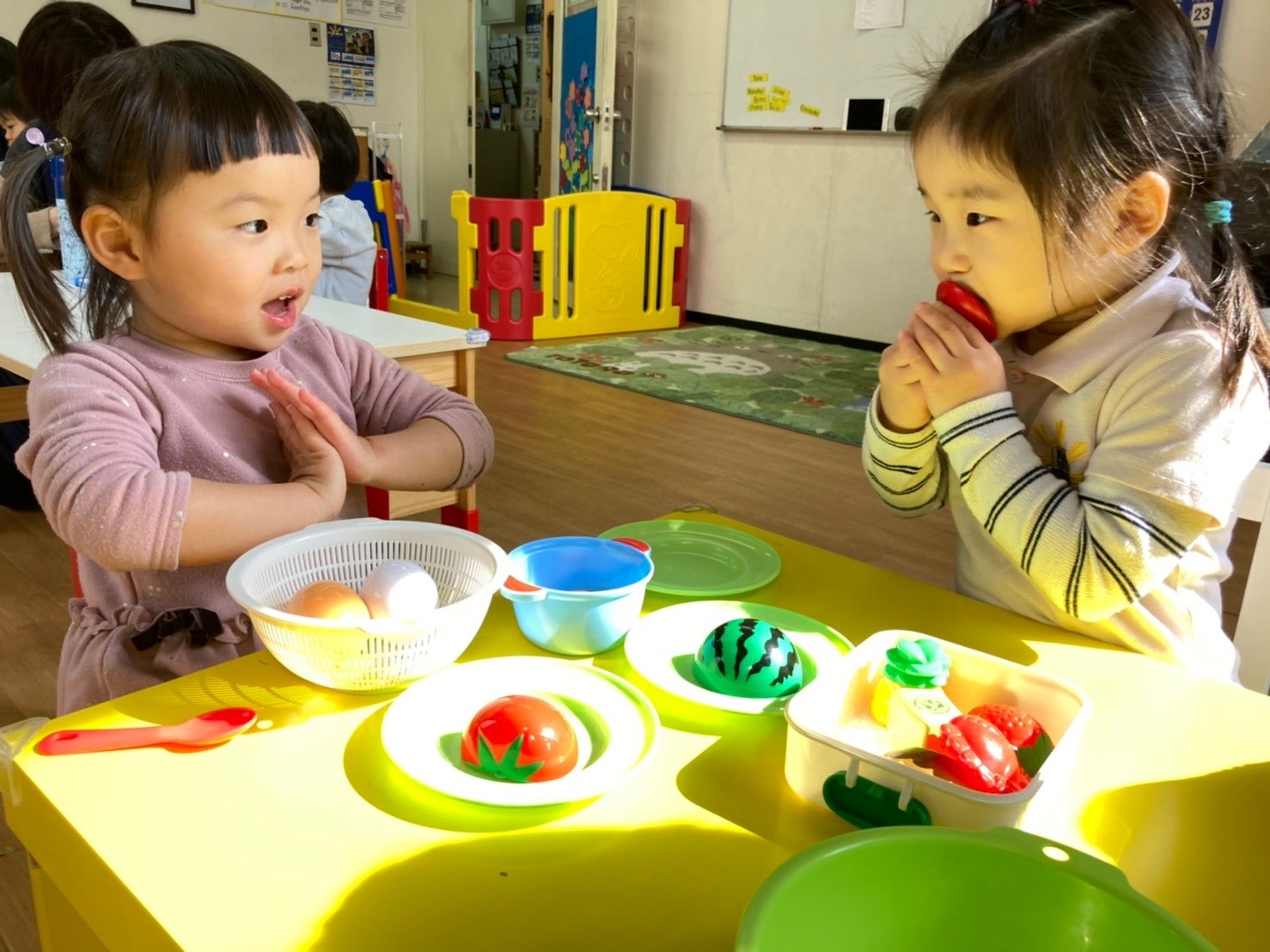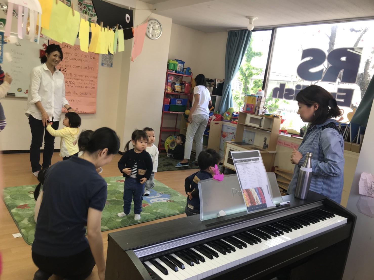 プリスクールの教室は光が差し込む明るいお部屋。たくさんのおもちゃやピアノがあります。