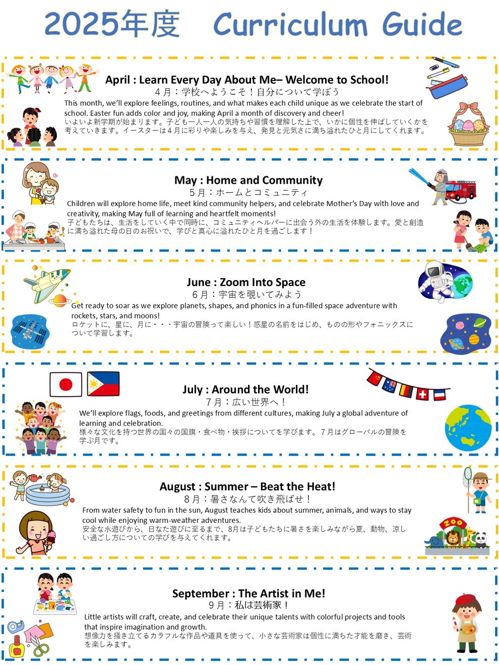 健康と安全という最優先事項に加え、お子様が楽しめる場を提供すること、友情を育むこと、そして自然に英語を学ぶ術を身に着けてもらうことを当校の目的といたします。