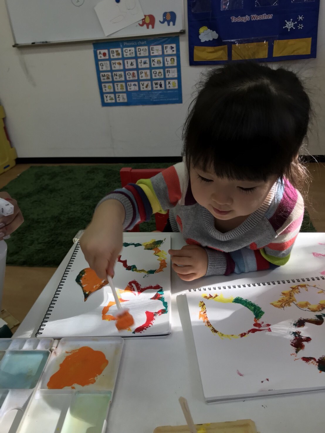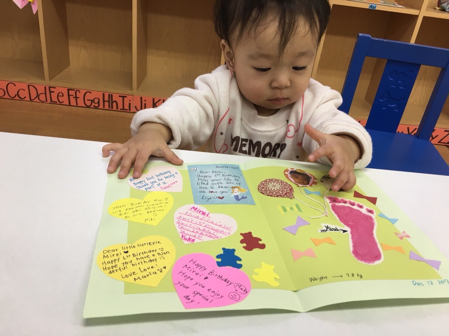 アルファベットで始まるフラッシュカード(教材カード)や教材用おもちゃを使って、記憶ゲームにトライします。アルファベットを反復して発声することで、新しい言葉が正しく発音(フォニックス)ができ、物語の読み聞かせによって言語能力、創造性、想像力を高めます。