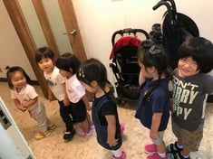 トイレの使用は自然かつ身体の機能発展に必要なことです。トイレが自分で出来、手が洗えるようサポートします。時間がかかるお子様には、手を洗う時間を一緒に数えてあげることで、標準的な時間と、最低限必要な時間を知ってもらいます。上手にできたお子様に笑顔で褒めてあげることで、ほかのお子さまもそれに習います。